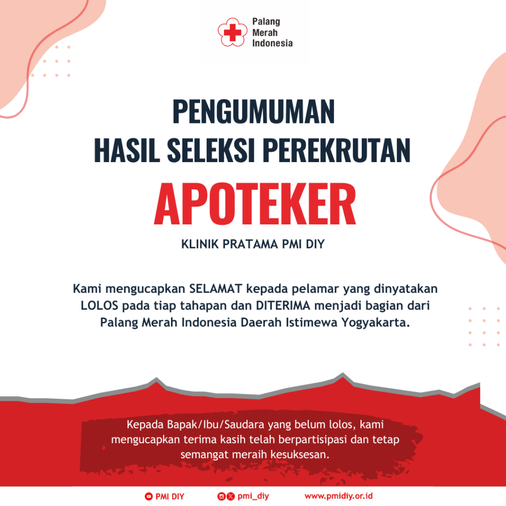 Panitia Seleksi Penerimaan Pegawai PMI Cimahi Tahun 2024 telah mengumumkan pelamar yang lolos seleksi perekrutan Apoteker Klinik Pratama hari Selasa kemarin (1/10/2024).